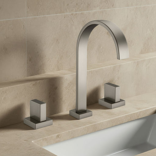 An arched, double handle widespread bathroom faucet constructed from brass and built to last. Inspired by mid-century modern design, this faucet pe...